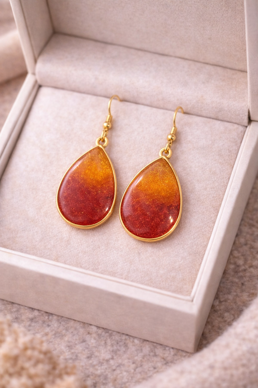 Inspired by the flamboyant sunsets of Marrakech , these teardrop earrings reveal a warm gradient of deep red, sunny orange and shimmering golden highlights.