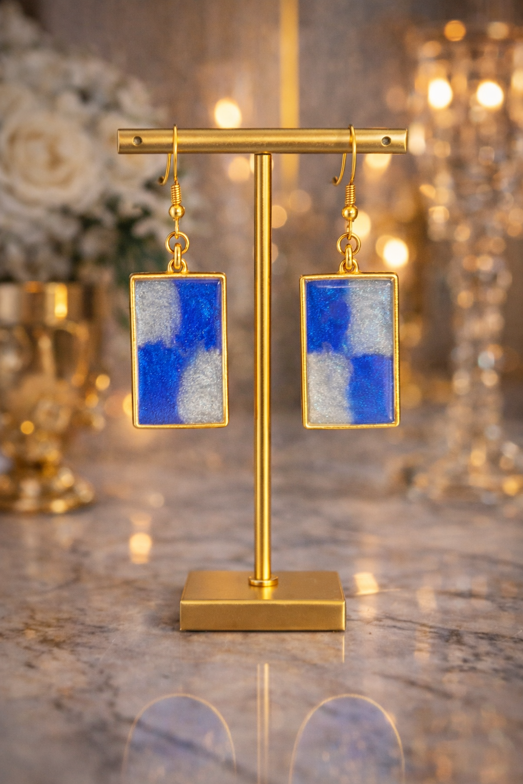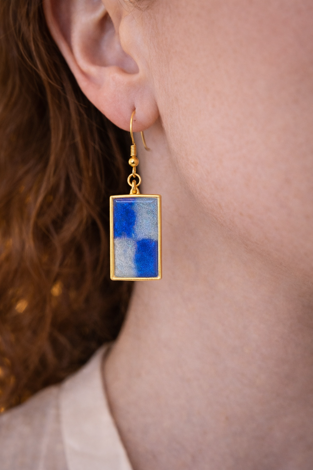 Boucles d’oreilles rectangulaires au bleu profond dégradé, rehaussées d’un effet nacré lumineux. Monture dorée élégante pour une touche chic et moderne.