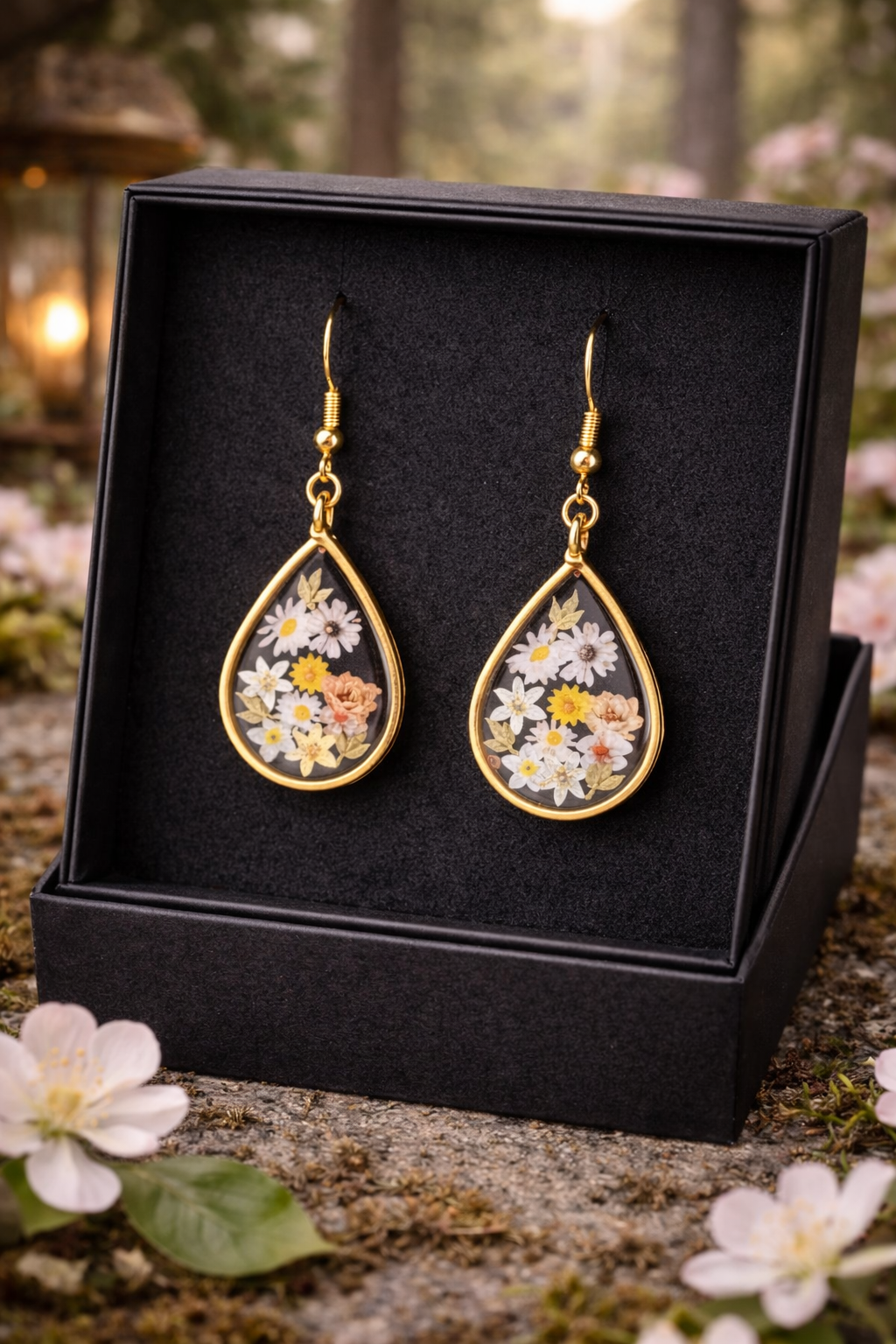 De délicates fleurs délicatement incrustées dans une résine cristalline, sublimées par un contour doré en forme de goutte. Légères et lumineuses, ces boucles apportent une touche naturelle et élégante à ton style.